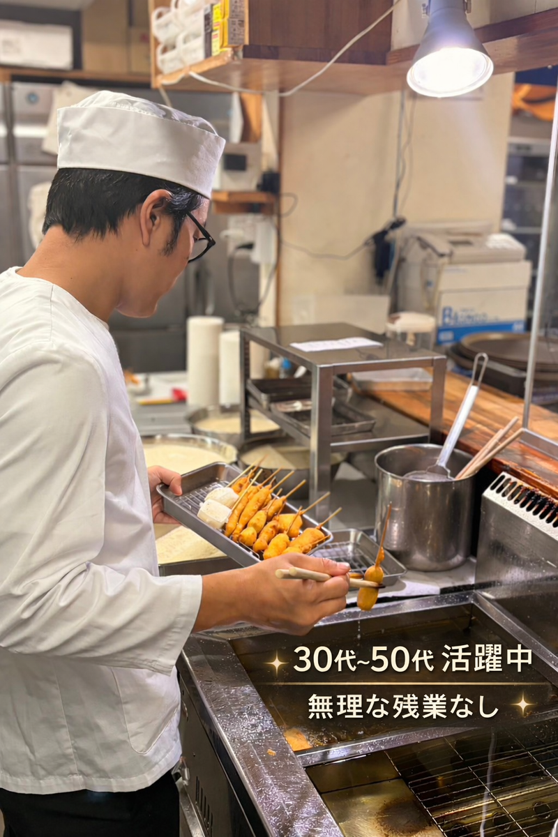 【月給34万円〜】完全週休2日制|20代〜50代幅広く活躍中|落ち着いて働ける串カツ店|長く働ける環境