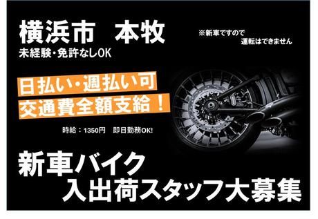 仕事内容 免許不要◎ バイク好き歓迎のシンプル軽作業! - ◎未経験でも安心スタート 工具の使い方やチェック方法も 丁寧に教えてもらえる環境。 ◎新品バイクを間近で見られるレア体験 海外から届く 最新モデルを扱えるワクワク感あり! ◎運転作業なし・免許不要 押して移動するだけだから、 バイク免許がない方も大歓迎。 - 海外から届く“新品バイク”を扱う、 他では出会えないレア軽作業。 免許不要で始められ、 未経験でも安心して取り組めるシンプル工程です。 ・・・・・・・・・・・・・・・・・・・・ 業務好調につき、 新車バイクの入出荷案件が増加中! 今回は新拠点を立ち上げに伴い、 新しい仲間を募集します。 ▼仕事の流れ▼  ̄V ̄ ̄ ̄ ̄ ̄ ̄ ̄ ̄ ̄ 【1】開梱 鉄枠に入った新車バイクを、 数名で協力して開けます。 【2】チェック作業 傷・不具合がないかを確認。 新品を間近で見られる魅力的な工程です。 【3】移動作業 出荷場へバイクを押して移動。 運転作業は一切ないので免許不要! *未経験スタート多数 *海外バイクに触れられるワクワク感 *20~50代まで幅広く活躍中 ・・・・・・・・・・・・・・・・・・・・ ★こんな方におすすめ  ̄V ̄ ̄ ̄ ̄ ̄ ̄ ̄ ̄ ̄ ・バイクに関わる仕事がしたい ・体を動かしながら働きたい ・単純作業より“少しだけ特別な仕事”がしたい ・未経験から始められる仕事を探している ================== 最後に 新車バイクを扱うこの仕事は、 毎日がちょっと特別。 「好き」を仕事にしたい方にも、 「未経験から挑戦したい」方にも最適です。 あなたの“ワクワク”が活かせる環境で、 新しい一歩を踏み出しませんか? 質問だけでもOK!お気軽にどうぞ◎