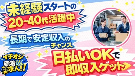 仕事内容 製品や部品のピッキング・入出庫 工場内で使用される金属部品のピッキングや運搬を行うお仕事です。 シンプルな作業が中心で、体を動かしながら働きたい方に適しています。 具体的には ・リストに基づいて金属製品を集めるピッキング作業 ・集めた部品を台車へ載せる作業 ・台車を使用した工場内での部品運搬 ・業務に慣れてきた後は、部品の梱包や出荷準備も担当 一部、20キロ程度の部品を扱う場面がありますが、持ち方のコツや作業方法は丁寧に指導します。 【40代までの男性に向けたポイント】 ・シンプルな作業が中心で未経験からスタートしやすい ・動きのある仕事で座りっぱなしが苦手な方に最適 ・自分のペースでコツコツ進められる環境 ・同世代スタッフも在籍しており馴染みやすい職場 【職場環境について】 ・空調設備はありませんが、スポットクーラーや防寒着の支給あり ・季節に応じた対策が取られているため安心して勤務可能 【こんな方におすすめ】 ・倉庫内作業や軽作業に興味がある方 ・体を動かす仕事を探している方 ・単純作業を繰り返すことが得意な方 ・長期的に安定して働きたい方 【職場環境】 落ち着いた雰囲気の中で、黙々と作業に集中できる環境です。 未経験からスタートしたスタッフも多く、分からないことはすぐに聞ける体制が整っています。