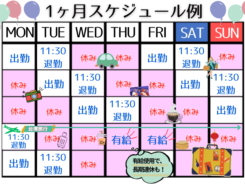 固定時間制 勤務時間詳細 総労働時間:1ヶ月あたり138時間15分 〜 158時間 10:30~翌11:30(実働時間19時間45分) (休憩5時間15分あり ▶仮眠3時間、1時間×2回=2時間、朝15分×1回) 実働は1回約20時間ですが、休憩・仮眠はしっかり5時間以上。 勤務は週2回なので、1週間のほとんどが“お休み”! まとまった自由時間がたっぷりとれる、 「メリハリある働き方」ができます。 ~1日の流れの一例~ 10:30:出勤・制服に着替える 11:00:朝礼・引継ぎ・予約数の確認など 15:00:チェックイン対応・フロント対応 24:00:仮眠(3時間仮眠+2時間15分休憩) 8:30:チェックアウト対応・引継ぎ 11:30:退勤