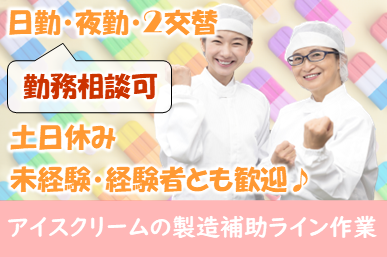 【急募】~アイス製造補助~勤務形態が選べる!\\働きながらお得に買えちゃう!//あの有名なコンビニスイーツも作っている工場でのお仕事★