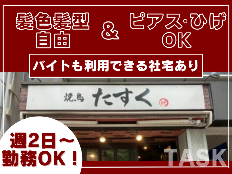 仕事内容 ✨家賃が浮くって最高。社宅完備✨ ✨髪型・髪色自由!ピアス・髭OK✨ ✨アルバイトでも利用できる社宅あり✨ 新橋のサラリーマンから愛される 焼鳥屋さんの「神田本店」での募集! おいしい焼鳥屋さんでの ホール・キッチン業務をお任せします! <主な業務内容> ■席へのご案内 ■オーダー取り ■料理・ドリンクの提供 ⚡昼14時から朝5時まで営業⚡  ̄ ̄ ̄ ̄ ̄ ̄ ̄ ̄ ̄ ̄ ̄ ̄ ̄ ̄ ̄ 営業時間が長いため、 自分が働きたいタイミングで働けます! 「今日は夜に予定がある」 ▶14時から20時まで働く 「今週はがっつり稼ぎたい」 ▶20時から朝5時まで働く などシフトの調整も可能です! ⚡深夜時給でがっつり稼げる⚡  ̄ ̄ ̄ ̄ ̄ ̄ ̄ ̄ ̄ ̄ ̄ ̄ ̄ ̄ ̄ 当店は朝5時まで営業しているため、 22時以降は深夜時給【1533円】です! 少ない日数でしっかり稼ぐことができます♪ ⚡焼鳥たすくとは?⚡  ̄ ̄ ̄ ̄ ̄ ̄ ̄ ̄ ̄ ̄ ̄ 駅近くで、多くの常連さんをはじめに 皆様に愛される、 そしてめちゃくちゃ美味い焼き鳥を出す お店を常に心がけています。 業務内容は1から丁寧にお教えします。 多くの方と一緒に楽しく働けるように、 採用にも力を入れていますので、 まずはお気軽に応募してくださいね♪