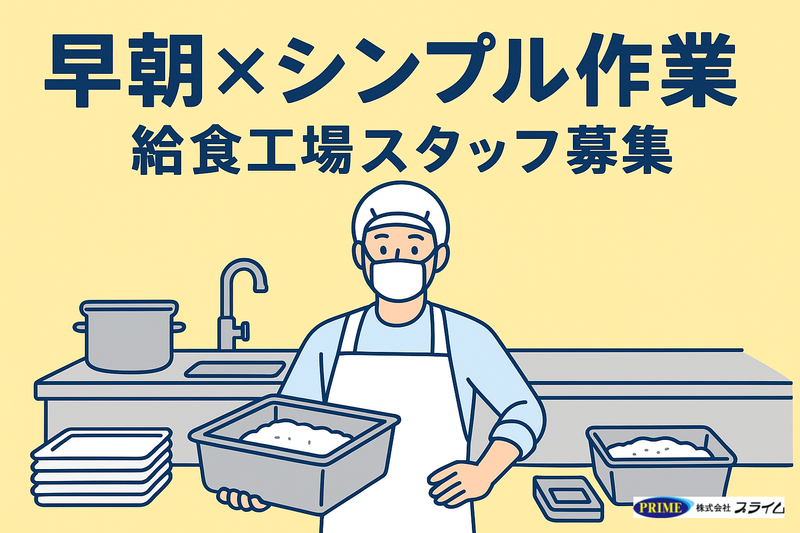 仕事内容 **\ 朝が強い方にピッタリ!未経験OK / 食品工場での早朝ワークスタッフ** 【仕事内容】 高齢者施設向けの給食を作っている工場でのお仕事です。 早朝からのシンプル作業が中心で、未経験でも始めやすい環境です。 ● 主な作業内容 ・調理した食品の運搬 ・下ごしらえされた食材の運搬 ・調理後の鍋などの洗浄 ・その他、かんたんな調理補助 【勤務について】 出勤時間は 4:00〜7:00で相談OK 早朝にしっかり働きたい方におすすめ! 【うれしいポイント】 ・昼食はバイキング形式で 無料!(全員対象) ・給与の 前払い・週払いOK ・未経験から安心スタート◎