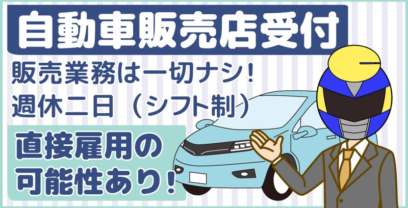 仕事の内容 【事務の経験が無くてもOK♪男性活躍中!】 \事務系のお仕事をお探しの方必見です!/ 外車販売店の整備部門での事務のお仕事です(^^)/ ≪具体的な仕事内容≫ ・電話対応 ⇒予約や状況確認に関する電話の対応 ・書類作成 ⇒予め用意されているフォーマットに入力するだけ♪ ・来店客の接客・取次ぎ などが主なお仕事となります。 車に関するお仕事ですが、専門知識は必要ありません(^^♪ 書類作成作業もパソコンの基本操作が出来れば問題ありません(^-^) 整備工場の事務スペースでのお仕事となりますが、空調完備の快適な環境でお仕事をして頂けます。 ≪勤務条件≫ ・長期派遣 ・勤務時間: 9:00~18:00 ・休日:シフト制(週休二日制) ※長期休暇あり(年末年始・GW・夏季) ・残業: なし ≪こんな方にオススメ!≫ ・パソコンの基本操作ができる方 ・事務系のお仕事をお探しの方 ≪現場の雰囲気≫ 20代~40代の男性活躍中! 頑張り次第では直接雇用の可能性あり! ≪福利厚生等≫ ・私服就業(トップス貸与) ・無料駐車場完備 ・受動喫煙対策あり(敷地内禁煙) ★本求人にご興味をお持ちの方は、応募する!より必須項目記載の上、 お問合せ下さい。 (お電話でのお問合わせ先:0120-67-3244 ※平日9時00分~18時00分)