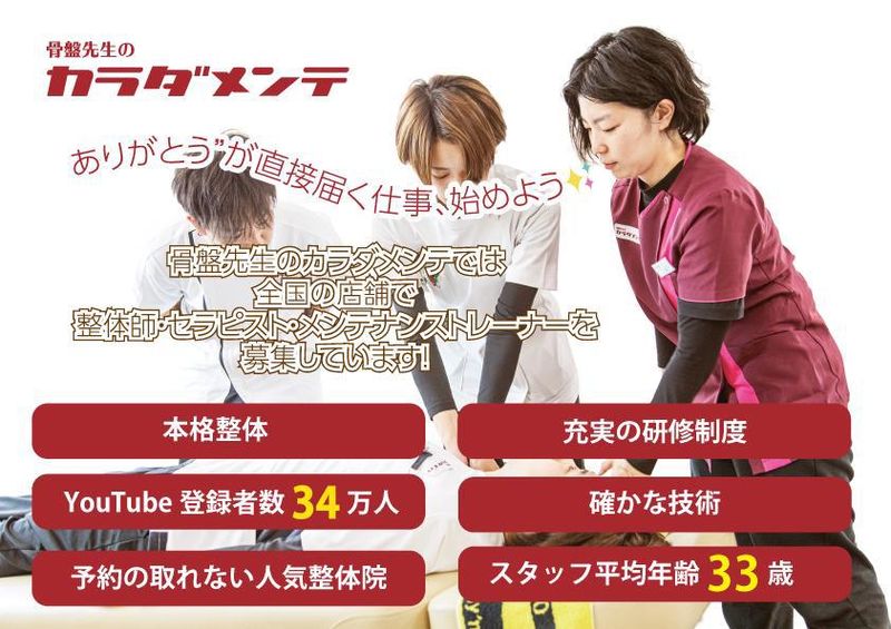 仕事内容 骨盤先生のカラダメンテは、「姿勢から心と体を整える」をコンセプトにした整体サロンです。骨盤・姿勢のバランスを中心に、ストレッチや筋肉調整を組み合わせたオリジナルの施術で、肩こり・腰痛・スタイル改善など、多くのお客様の悩みに寄り添っています。明るく清潔な店内で、お客様との会話や信頼関係を大切にしながら、一人ひとりに合わせた丁寧な施術を提供しています。身体の変化を実感できる喜びと、感謝の言葉を直接いただけるやりがいがあります。 <埼玉県初出店!オープニングメンバー募集!> これまで全国で培ってきた技術と理論をもとに、大宮駅周辺で店舗をオープンすることになりました。今回の募集は、すでに出来上がった店舗の一員ではありません。お客様との関係づくり、店舗の雰囲気、信頼の積み重ね。そのすべてに関われる、立ち上げメンバーだからこそ得られる経験があります。 <人に向き合う仕事を、AIに奪われない技術で> 「人と関わる仕事がしたい!」その気持ちがあれば、経験は問いません。整体師のお仕事は、機械やAIでは代わることのできない“人の手と感覚”が価値になる仕事です。 カラダメンテでは、未経験の方でも基礎から学び、実際に人の身体を改善できる技術を段階的に身につけていける環境があります。流行りに左右されず、これからの時代でも必要とされ続ける仕事を、ここから始めてみませんか。 ★この仕事がAIに代われない理由(3つ) ①人の体は一人ひとり違う →数値やマニュアルだけでは判断できない感覚が必要です。 ②触れてわかる情報がある →筋肉の張り、関節の遊び、反応の変化は人にしか感じ取れません。 ③信頼関係が結果を左右する →安心感・会話・空気づくりはAIでは再現できません。 <34万人が支持する整体理論> カラダメンテの院長は、YouTube登録者34万人超の「骨盤先生」。施術の考え方や技術を、多くの人に分かりやすく伝え続けてきた腕利きの整体師です。その理論を、動画を見る側ではなく「実践する側」として技術を習得できるのが、カラダメンテで働く一番の魅力です。 ◆YouTube https://www.youtube.com/channel/UC1OdBHC5rlBb1VRtxrlGl4A ◆Instagram https://www.instagram.com/kotsubansensei/ <週2日〜勤務OK> 自分の都合に合わせてスケジュールを組めるよう、雇用形態を「業務委託」にしています。 技術を学び、手に職を付けてバリバリ働きたい方など、それぞれのライフスタイルに合わせて働き方を選択できます。 例) 「週2日だけ入りたい!」 「週5日でガッツリ稼ぎたい!」 「夕方から働きたい!」 などなど、自分で選択可能です! <具体的な仕事内容> ■お客様のご来店対応・受付業務 ■カウンセリング(身体の状態や悩みのヒアリング) ■骨盤・姿勢バランスのチェック ■施術(骨盤矯正・筋肉調整・ストレッチなど) ■施術後のアドバイス(セルフケアや日常姿勢の指導) ■予約管理・スケジュール対応 ■店内の清掃・ベッドや備品の準備 ■お客様の施術記録・経過管理 ■受付・会計 ■カンファレンス(お客様の情報・技術の知識を共有します) ■明るいコミュニケーションでお客様との信頼関係づくり など <研修について> 未経験の方でも安心してスタートできるよう、しっかりとした研修制度があります。まずは基本的な姿勢の知識や体の仕組み、施術の考え方を丁寧にレクチャー。その後は、実際の施術手順や触れ方、力の入れ方、声かけまで、しっかり学べます。段階を踏んで少しずつスキルアップしていくので、未経験からでも確かな技術と自信を身につけられます。 ※寮を完備しています(お気軽にご相談ください)。 <難しい技術だからこそ一生もの> カラダメンテの整体技術は、短期間で身につくものではありません。 だからこそ、時間をかけて技術を積み上げてきた整体師の価値を正当に評価しています。知識・経験・技術は、あなたの「一生使える財産」。その価値を消耗させる働き方はさせません。「挑戦してみたい!」という心意気のある方を全力でサポートします!