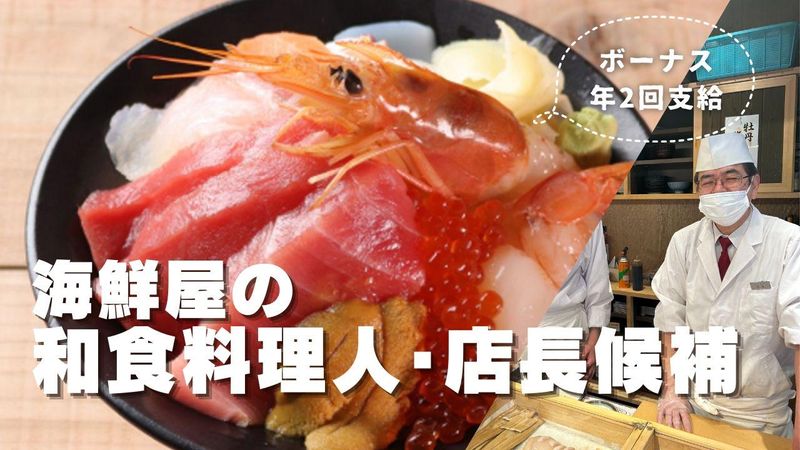 仕事内容 <仕事内容について> 仕込み、調理、盛り付けなどの調理場全般をお任せします。 毎日仕入れる新鮮な鮮魚を捌いたり、盛り付けをしたりが基本業務となります。 鮮魚の素材を最大限引き出すために、丁寧な仕事にこだわっています。 美味しいお料理を作る事はもちろんの事、 おもてなしの心や高いスキルを身見つける事が出来ます。 さらには、メニュー開発・提案、スタッフ管理などマネジメント業務もお任せしたいと考えています。 料理人としてのスキルアップ、 店長候補としてのマネジメントスキルが身に付けます <ハレの日魚河岸千両について> 海鮮ひつまぶし丼が売りの当店。 海鮮ひつまぶしが有名でメディアでも度々紹介されています。 外国人のお客様の多く、国際色豊かなお店です。 席数はあまり多くありません。 「肩肘のはらないカジュアルな店内で入りやすい」 「各地から取り寄せたウニの食べ比べなどができる!」 というお客様の声も! <当社について> 私たちは「築地から元気を発信する」!! 築地・東京ソラマチ・池袋・軽井沢・御殿場に様々な業態を12店舗展開中。 元気を発信するお店を今後も新規出店行っていきます。 スタッフが働きやすく、居心地がよい環境、そしてお客様の期待を大きく超える店舗づくりを展開していく予定です。 そのためにも日々、「労務」、「待遇」、「独立支援」、「キャリアアップ」の4つの面において働きやすい、働きたい環境づくりを常に進めています。 頑張りをしっかり給与や休日、手当へ反映させる仕組みがあります! 各種手当、制度に関しての詳細は面接時にご確認ください。 <従業員について> 20代・30代・40代・50代と幅広い年代のスタッフが活躍中! 「捌ける鮮魚のネタが多いから」 「家から近く通いやすい」 「若いうちからスキルアップしたい」 「仕事もプライベートも両立したい」 という思いで応募をしている方もいます。