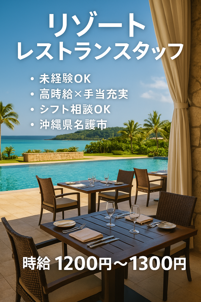 時給1,200円~1,300円 給与 時給1200円〜1300円 【時給】1,200円〜1,300円 <内訳> ・未経験:1,200円〜 ・経験者(レストラン経験1年以上など):1,300円〜 <各種手当> ・残業手当:25%UP ・深夜手当:25%UP(22:00〜5:00) ・早朝手当:25%UP(5:00〜7:00) ・年末年始手当:30%UP ・通勤手当:名護500円/その他地域1,000円 【昇給あり】 勤務評価やスキル習得に応じて時給UP✨