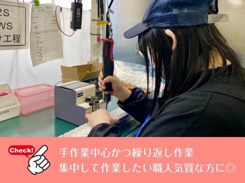 仕事内容 ~*~*~*~*~*~*~ ⭐働きやすさのPOINT⭐ ~*~*~*~*~*~*~ ❏女性のみの職場 ❏扶養内OK!家計の足しに◎ ❏主婦さん多数活躍中! ❏土日休み&長期休暇あり ※ただし祝祭日は稼働 ❏週3~4日OK+残業ナシ♪ ❏未経験OK!教育体制も万全 ||◣ 仕事内容 ◢||  ̄ ̄ ̄ ̄ ̄ ̄ ̄ ̄ ̄ ̄ 【目視チェック(検査)】 小さなプラスチック部品に 不備がないか目視でチェック! 見るポイントは決まっているので、 すぐ覚えられますよ◎ 【組立・組付け】 小さなプラスチック部品を 電動ドライバーで ネジ締めして組み立てるだけ! 家庭で使うドライバーよりも簡単で、 スーッとネジが締まるのでラクラク♪ 力仕事や難しい操作は一切なし! ||◣ お仕事の特徴◢||  ̄ ̄ ̄ ̄ ̄ ̄ ̄ ̄ ̄ ̄ ⏩接客なし➡工場内で落ち着いて作業できます ⏩一人ひとり専用スペースあり➡集中しやすい ⏩作業は交代制➡無理なく続けられる コツコツ・モクモク作業が 好きな方にピッタリ♪ 周りを気にせず、 自分のペースで進められる環境です◎ ||◣ 未経験でも安心スタート ◢||  ̄ ̄ ̄ ̄ ̄ ̄ ̄ ̄ ̄ ̄ ̄ ̄ ̄ ̄ 今働いているスタッフのほとんどが 未経験からスタート! 特別なスキルや知識は一切不要です。 入社後は、 先輩がマンツーマンで丁寧にサポート。 作業の流れやポイントを しっかり教えるので、すぐに慣れますよ♪