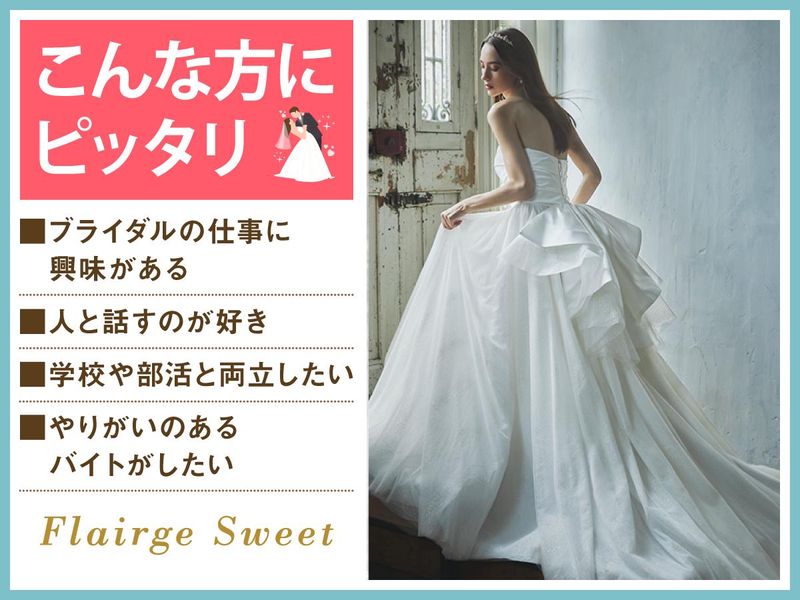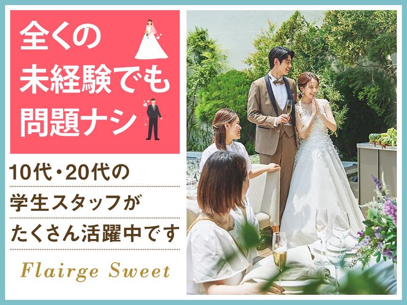 仕事内容 *ガーリーで大人な雰囲気の結婚式場* 感動いっぱいの結婚式を一緒にサポート♪ 授業やサークルのない日に勤務OK★ WワークOKで学生スタッフ多数活躍中! 「人が喜ぶ姿が好き」「サプライズが好き」 という方必見!スキルや経験は一切不要♪ 一緒に素敵な結婚式を演出しましょう* フレアージュスウィートは ナチュラルでかわいい雰囲気のガーデンと、 レンガ造りのチャペルがある結婚式場。 ウェディングのお手伝いをするお仕事です◎ <主なお仕事内容は…> 結婚式場スタッフとして 次のお仕事をお任せ! ■会場の準備 ■お客様の上着や荷物のお預かり ■お席のご案内 ■結婚式のお料理・ドリンク提供 ※キッチン業務はありません◎ ―――――――――――――――― 学生が活躍中! オススメポイントはこちら★★ ―――――――――――――――― ・授業やサークルとの両立応援! ・週1日~1日4時間~OKで融通◎ ・絶品のまかないアリ(^^) ・同世代が多くて安心◎ まかないは本格料理人たちが 美味しい食材を使って作ってくれます♪♪ 現在は10代~20代中心に アルバイト・パート18名が在籍中! 大学生・専門学生12名、高校生3名と 同世代の学生さんが多数在籍♪ 青森保険大学、青森公立大学、 中央学院大学に通う学生も多いので、 お友達同士の応募も大歓迎です! ブライダル=女性と思われがちですが、 会場の設営をお任せしたりなど、 性別問わず活躍できます! 男女ともに活躍中です! 一度バイトを始めると長く 続けてくれる子が多いフレアージュスウィート。 敷居が高いイメージがあるかもしれませんが みんなで協力しながら準備して… 毎日、文化祭みたいな雰囲気なんです♪ 素敵な仲間に出会える そんな場所になると思います◎ ついでに… 社会で活躍するためのマナーも学べますし、 実は就活に役立つのもうれしいポイント! ―――――――――――――――― 特別な1日をサポートするお仕事 具体的な仕事の流れは? ―――――――――――――――― ▶STEP.1 ミーティング 披露宴の流れやお料理について スタッフ間で事前に確認して 式中にバタバタしないようにします◎ ▶▶STEP.2 披露宴会場の準備 お席に置く名札や ゲストの方に渡す引き出物を確認したり グラスを磨いたりして準備します。 ▶▶▶STEP.3 お客さまのお出迎え 荷物をお預かりし、 待合室でドリンクをお出しします! ▶▶▶▶STEP.4 ホール業務 お席にご案内し、順番にお料理や ドリンクを提供します◎ ―――――――――――――――― 未経験者歓迎! みんなで助け合う雰囲気です ―――――――――――――――― 最初は結婚式の見学からスタート! 見学後は本番じゃないところで、 同世代を集めて研修を実施。 飲食業やホールスタッフが 初めての子には、 お盆の持ち方から教えます!