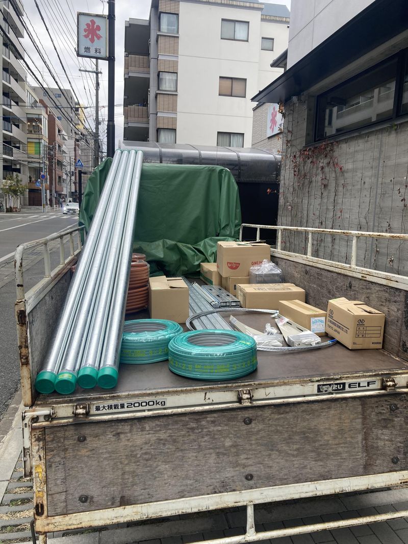 2t平車で電気ケーブルやスイッチなどの配送ドライバー