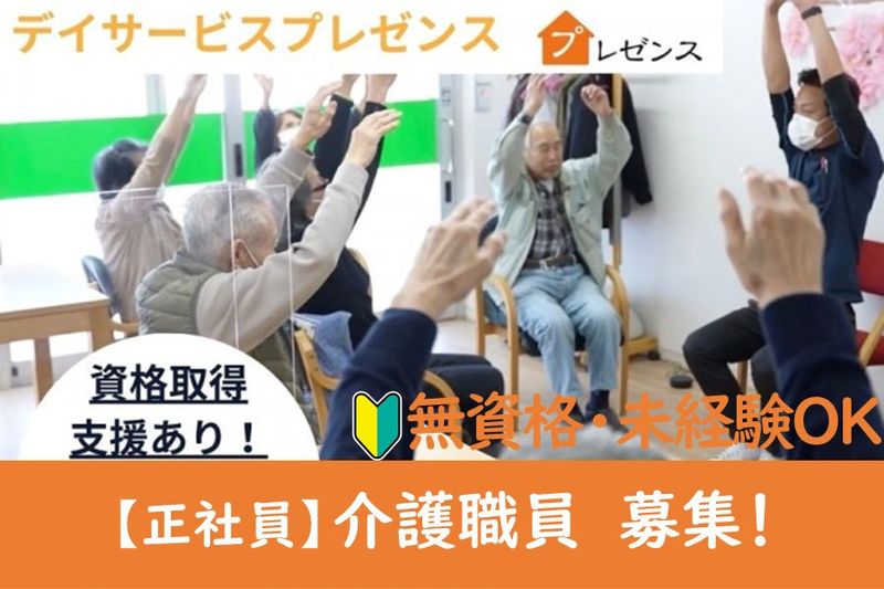 【仕事内容】 デイサービスプレゼンスの新規介護スタッフ募集! 無資格、未経験だけど介護の仕事をはじめようと思っている方! 介護の仕事をしたいと思っていても、将来働き続けることができるのか不安に思っている方! デイサービスプレゼンスでは、人と人の繋がりを大切にし必要とされる存在、喜びを実感できる施設を目指しています。 一緒にお仕事しませんか? 株式会社PRESENCEは、横浜市発の「みんなにやさいしい介護のプロを目指す」プロジェクト2018、2019年に受賞された認定事業所です。 【具体的な仕事内容】 ・身体介護(見守り、移動介助) ・入浴(洗体補助、着脱補助) ・排泄介助 ・食事(配膳、下膳、見守り、食事介助) ・レクリエーション(実行、企画) ・介護記録 など 【デイサービスプレゼンスの魅力】 ===================== 若い世代が活躍しやすい環境 ===================== 30代以下を中心に幅広い年代層の職員がいるので、同年代での意見交換はもちろん困った時はベテランの職員に相談することも出来ます。 ========================== 業務効率ツールで手書きの手間を削減 ========================== 業務上の入力作業はiPadを使用して手書き作業の負担を軽減しています。 ========= 駐車場無料 ========= マイカー通勤・バイク通勤が可能で、駐車場も無料でご利用いただけます。 ==================== 資格取得支援・独立支援あり ==================== 介護初任者研修、介護福祉士、ケアマネジャーなどの資格取得や、起業や独立を目標にしている方を支援します。 =================== 職員の生活を支援します =================== 子育て中の方への支援をはじめ、生命保険や不動産、相続関係、親族の方の介護など、職員のサポートをしています。 ぜひご応募くださいね。 いきなりの面接は不安な方には施設見学も大歓迎です。 働き方の相談や、仕事内容のご質問などのお問合せもお気軽にご連絡ください。 ★体験入社可能です! ・面接後、希望者は1日(半日もOK)体験入社可能です。 ※お給与・交通費ともに支給致します。