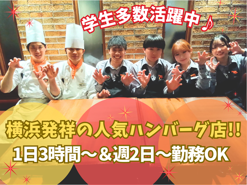仕事内容 \✨友達と一緒に応募もOK✨/ 新たな仲間に出会えるチャンス♪ 「学校が休みの時」など土日・祝日や ディナー帯(15時~23時)の勤務大歓迎✨ 週2日~、1日3時間~のスキマ時間でOK⭐ 学生中心の環境で友達の輪がグンと広がる◎ 「夜の短時間だけ」「授業の後に稼ぐ!」 など働き方はお気軽にご相談ください! ――☆・。―――――――――――。・☆―― ハンバーグ&ステーキレストランで ホールスタッフのお仕事! 【仕事内容】 ✅サラダやハンバーグの調理 ✅ドリンクの作成 ✅簡単な仕込み ✅レシピ通りに盛り付け ✅洗い物 などをお任せします! ー \✨丁寧な研修でレベルUP✨/ 最初の40時間は先輩が マンツーマンで研修! 覚える事はたくさんありますが、 調理のスキルやマルチタスク能力、 コミュニケーション能力を 培う事が出来ます✨ 就活にも役に立つスキルをGET♪ 未経験の方でも、 調理について基礎から学べたり、 料理をすることに慣れるので、 家庭で活かせるスキルが身に付きます! みんなでキッチンを回せた時の 達成感はバツグンです◎ 勿論、何かあれば社員さんや 先輩たちがしっかりサポートします⭐ スキルUPしていけば、 リーダーになれる事も! リーダーの証である専用のネクタイや バッジをGETしましょう! ー \✨ハングリーならではの特典✨/ 月に1度お客様としてご来店してもらい、 自慢のハンバーグを無料で食べられます! スタッフ同士でご来店いただき、 コミュニケーションの場として 利用するのも大歓迎です◎ ご来店日については、 できる限りご希望を考慮します⭐