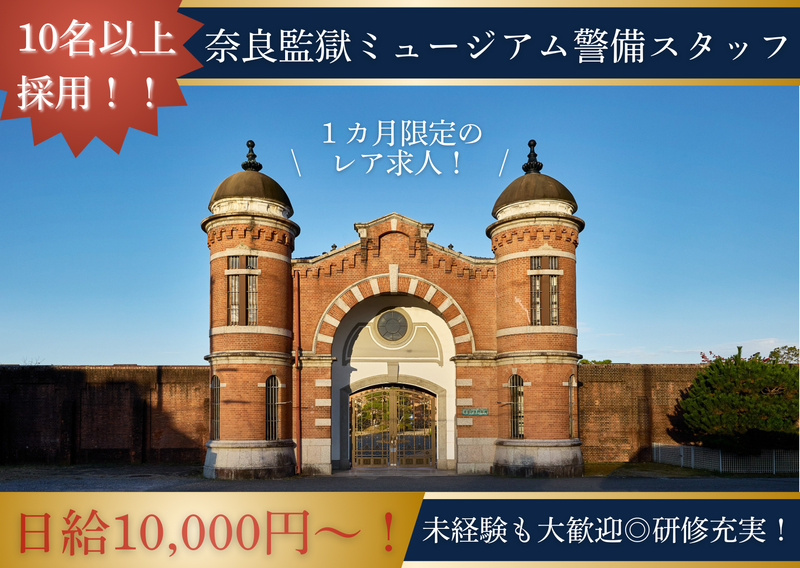 仕事内容: \新しい歴史空間を、安心と心地よさで支える仕事/ ◇◆奈良監獄ミュージアム 立ち上げメンバー募集!◆◇ 「特別な施設に関わる仕事がしたい」 「人を迎え、支える役割にやりがいを感じる」 そんな想いを、奈良監獄ミュージアムの現場で活かしませんか? 2026年4月27日に開館する奈良監獄ミュージアムは、国の重要文化財「旧奈良監獄」を保存・活用した文化施設です。 私たちはその世界観を守りながら、 お客様が安心して、心地よく過ごせる環境を支える役割を担います。 この仕事は、 「お客様の安全を守る警備・誘導」だけではなく お客様へのご案内、気配り、空間への配慮を大切にしたポジションです。 \気持ちよくお迎えし、気持ちよくお見送りする役割/ ・来場車両の安全誘導 ・駐車場のご案内 ・歩行者の安全確保 ・混雑時のスムーズな交通整理 新規開業施設だからこそ、 ・どうすればより快適に過ごしていただけるか ・この歴史ある施設の雰囲気をどう守るか をチームで考え、意見を出し合いながら創り上げていきます。 接客・販売・サービス業で培った 人と向き合う力、気づく力、落ち着いた対応力を、ぜひここで活かしてください✨ 「奈良監獄ミュージアム」という特別な場所を、 安心と心配りで支える立ち上げメンバーとして仲間をお待ちしています。