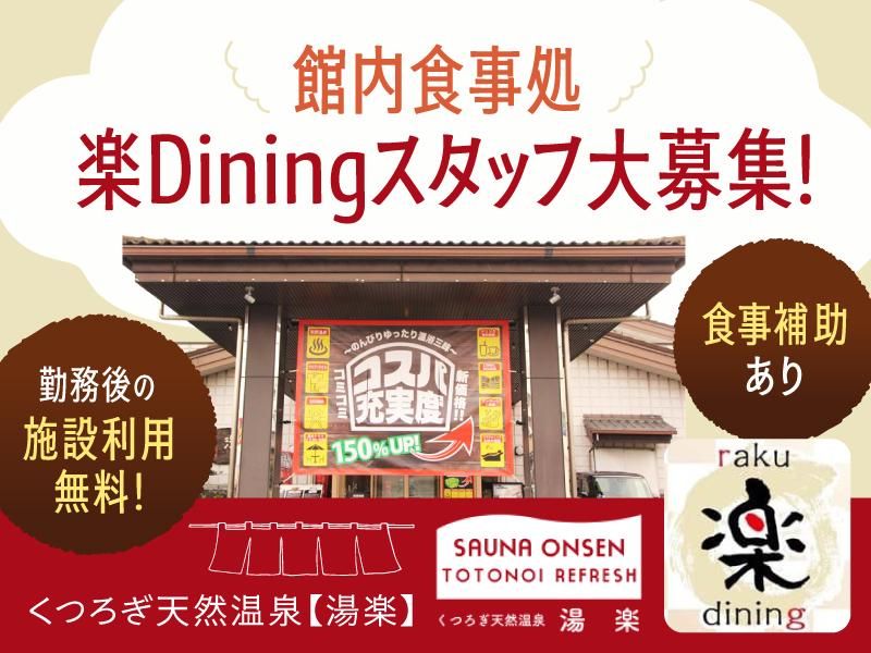 仕事内容 リニューアルオープンから絶好調✨ 湯楽の食事処 【楽Dining】 春のスタッフ増員募集!!! ◎気配り・心配りができる方、大歓迎! ◎温泉・サウナ好き歓迎! ◎施設はいつでも利用無料 ◎メディアで紹介されたことも! お風呂やサウナはもちろん グルメやアミューズメントも 楽しめる人気のスーパー銭湯 『くつろぎ天然温泉 湯楽』 館内の食事処『楽Dining』の 新しいスタッフを募集します! <フロア>接客・配膳・洗い場など <キッチン>調理補助・洗い場など 主婦パートさん・フリーターさん・ 大学生活躍中! 外国人・留学生の方も応援! 日常会話程度の日本語が話せればOK! 日本の文化に触れられます✨