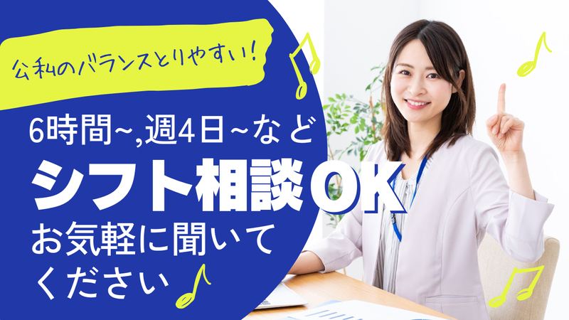 勤務時間詳細 09:00~18:00(休憩1時間) ※1日6時間・週4日~など、勤務時間・ 曜日は相談の上変動可能です! ※採用時の開始日の相談可 ご希望についてお気軽にご相談下さい♪