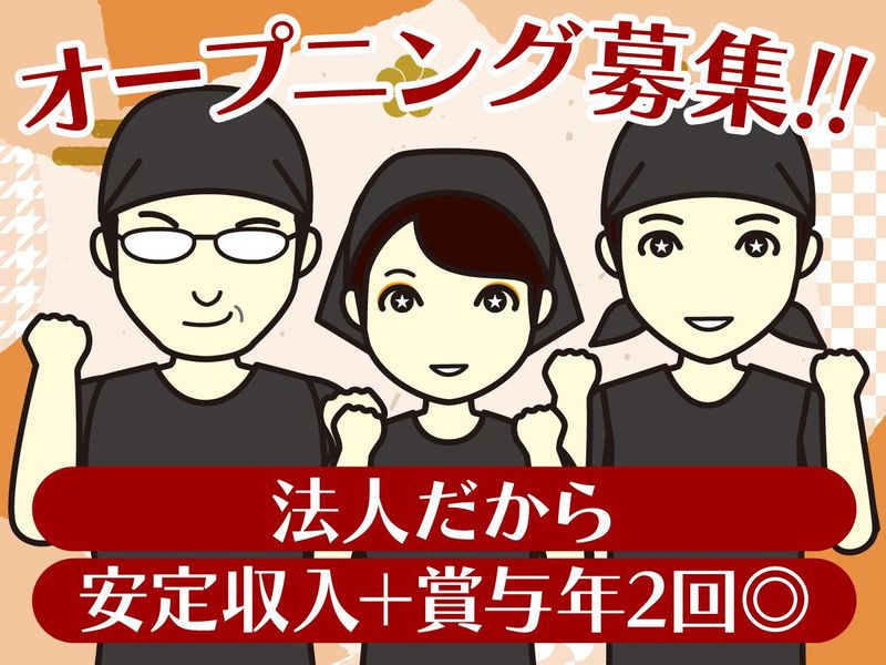 仕事内容 ✅ 将来は独立も夢じゃない! 経営ノウハウまで学べるチャンスあり ✅ 月給25〜35万円&賞与年2回 安定した収入でステップアップ ✅ 成長中の新店舗! 「自分の店を持つ」が現実になる職場 ✅ 車通勤OK&駐車場あり アクセス楽々で通勤も快適! キッチン業務とホール業務を兼任して 店舗運営に幅広く関われます! ■ キッチンスタッフ お肉の仕込み、捌き、焼き 盛り付け・洗い場対応 食材管理・在庫発注 メニュー開発もOK ■ ホールスタッフ お客様のご案内 配膳・ドリンク作り 店舗運営・シフト管理補助 お客様とのコミュニケーションも重要! \2024年4月に法人化/ より安定したお仕事にするためにも 今年の4月に法人化しました。 今後もより待遇を整えて、 ”スタッフがもっと働きやすい環境”にします!