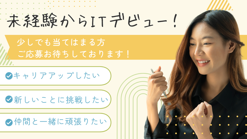 求めている人材 【応募資格】 学歴・経験一切不問/第二新卒・社会人デビューも歓迎! \こんな方にピッタリ!/ ◎Webサイトやアプリの仕組みに興味がある ◎フロントからクラウドまで幅広く学びたい ◎自分の作ったものが「見える」仕事がしたい ◎HTMLやデザインに触れながらスキルを伸ばしたい ◎IT業界で手に職をつけたい ◎頑張りをしっかり評価されたい ◎チームでものづくりを楽しめる方