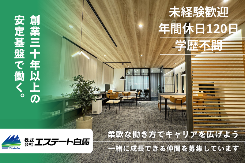 仕事内容 #高額歩合還元 #未経験歓迎 #異業種出身も活躍中 ★営業活動に専念できる「完全反響」スタイル 「不動産の営業って、ひたすら電話したり飛び込んだりするんじゃ…?」 そんな心配は無用です!当社は100%反響営業。ネットや広告を見てお問い合わせいただいたお客様へのご提案なので、無理な勧誘は一切ありません。 【具体的な仕事内容】 ■物件のご提案・ご案内 ご来店・お問い合わせいただいたお客様へ、希望に合う物件をご紹介。 ■契約・ローンサポート 住宅ローンの相談など、購入に向けたお手伝い。 ■引き渡し 夢のマイホーム完成・入居までをプロデュース。 《POINT》 1人あたり月10〜13組ほどのお客様を担当します。5〜6名のチーム制なので、困った時はすぐに先輩に相談できる環境です! ★★当社で働く魅力★★ ☆「自由」と「高収入」を両立 完全歩合制(フルコミッション)のため、頑張りはダイレクトに報酬へ反映されます。 1件の成約で20万円〜100万円の報酬を得ることも珍しくありません。「今の年収を大きく超えたい」という意欲を全力で応援します。 ☆ノルマ・飛び込み・残業なし ノルマなし: プレッシャーに追われるのではなく、お客様に寄り添う提案ができます。 ☆残業少なめ 月15時間以下。自分の時間や家族との時間を大切にできます。 ☆記念日休暇を推奨 「大切な人の誕生日は休んでください」という文化が根付いています。 ☆創業32年の安定基盤 グループ全体300名、右肩上がりの成長を続ける「株式会社エステート白馬」。「健康経営実践事業所」にも認定されており、スタッフが心身ともに健やかに働ける環境を整えています。
