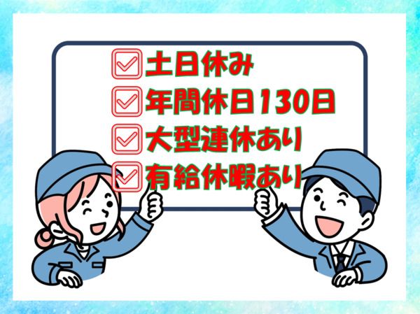休日休暇 ✅年間休日130日! 土日祝休み 長期休暇あり (GW/夏季休暇/年末年始) 有給休暇あり (入社半年後に10日付与)