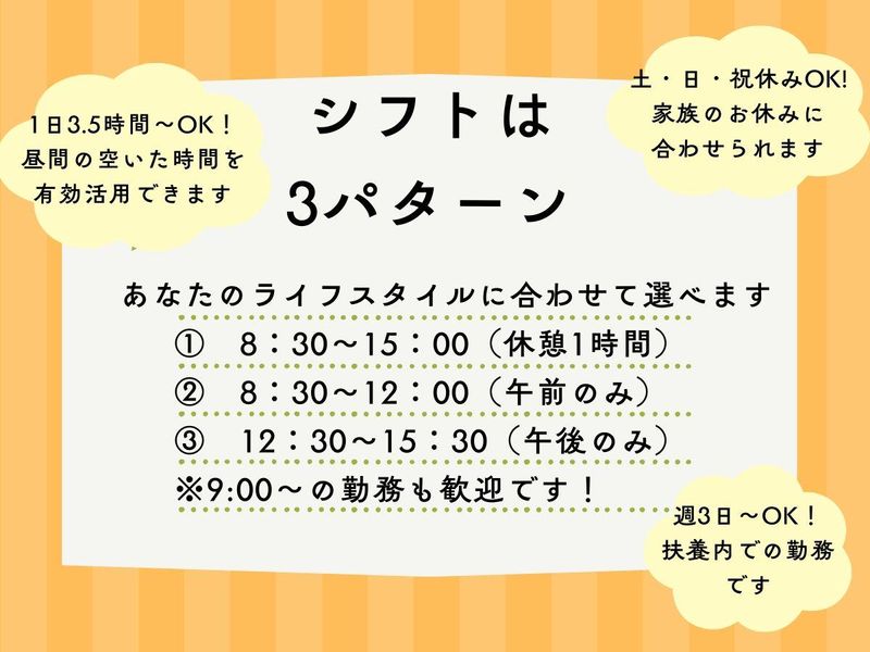 シフト制 勤務時間詳細 8:30~15:00 (休憩1時間) ※9:00~の勤務も可(応相談) ※業務量により多少前後有 ◆週4日勤務 ◆「午前のみ」「午後から」の 勤務も可能です!(応相談) ◆シフトは都合を考慮して決めます! お気軽にご相談下さいね☆