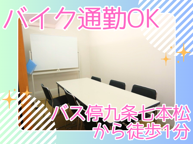 職場環境 50代多数女性が多い落ち着いた職場。屋内禁煙で清潔感のある環境を整えています。バイクや自転車での通勤も可能で、京都市一円をスムーズに移動できるようサポート体制を整えています。 喫煙所:なし(敷地内全て禁煙)
