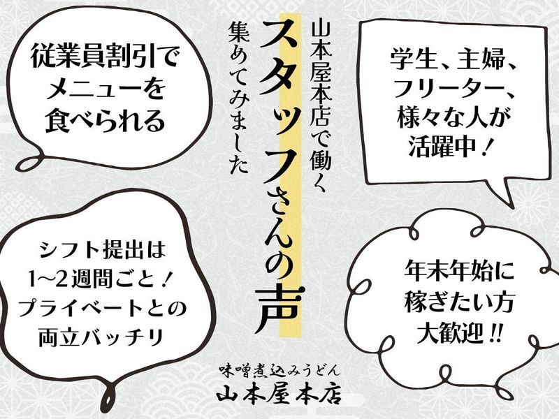 仕事内容 / ⭐学校終わりに 家の近くでアルバイト! ⭐家事の合間に、 週2日から始めるキッチンのお仕事♪ \ 味噌煮込みうどんの専門店として、 多くのお客様に愛される山本屋本店での キッチンスタッフを大募集! ________ ⏩POINT⏩  ̄ ̄ ̄ ̄ ̄ ̄ ̄ ̄ ☆副業・WワークOK ☆シフト自由 ☆平日のみOK ☆未経験大歓迎! ――――――お仕事詳細―――――― <キッチン> ・洗い場 ・一品料理の盛付 ・食材の計量や仕分け・下ごしらえ ★注文はお客様にタブレットを使って 注文していただくセルフスタイル! ―――こんな仲間が働いています――― ✨プライベート重視の学生さん  ̄ ̄V ̄ ̄ ̄ ̄ ̄ ̄ ̄ ̄ ̄ ̄ ̄ ̄ 学業、サークル活動、友達との遊びなど、 プライベートの予定に合わせて働けます◎ 特別なスキル等は必要ないので、 「初めてのバイトだから不安…」という バイトデビューの方にもオススメです! 学校行事や旅行の際にも融通が利きます◎ ✨安定したシフトでしっかり働きたい…  ̄ ̄V ̄ ̄ ̄ ̄ ̄ ̄ ̄ ̄ ̄ ̄ ̄ ̄ ̄ ̄ ̄ ̄ 名古屋のご当地グルメとして、 観光客にも大人気の味噌煮込みうどんを 提供する山本屋本店。 ひとつの場所で、安定して 長く働きたい方におすすめのお店です。 ✨家事と両立したいしゅふさん  ̄ ̄V ̄ ̄ ̄ ̄ ̄ ̄ ̄ ̄ ̄ ̄ ̄ ̄ 「家事をこなすだけの毎日じゃつまらない…」 「久々にお仕事を始めてみたい」 「外に出かける口実が欲しい(笑)」 「家事だけだと時間が余っているので…」 などなど、主婦(夫)さんも活躍中です! ✨店長から一言♪  ̄ ̄V ̄ ̄ ̄ ̄ ̄ ̄ ̄ 仕事とプライベートの両立、応援します! シフトはお気軽にご相談くださいね♪ 一緒に楽しく働けることを楽しみにしています! 。☆。・*・。☆。・*・。☆。・*・。☆。・*・。☆。