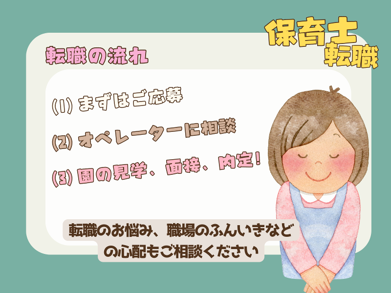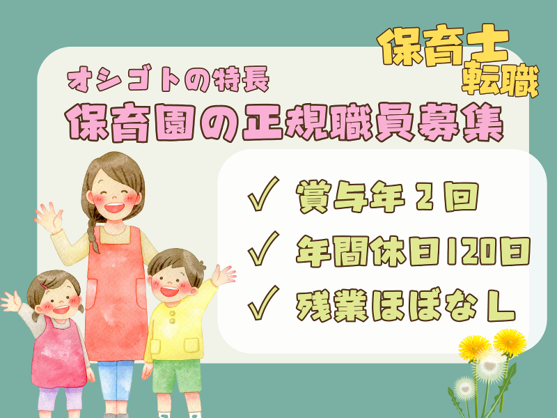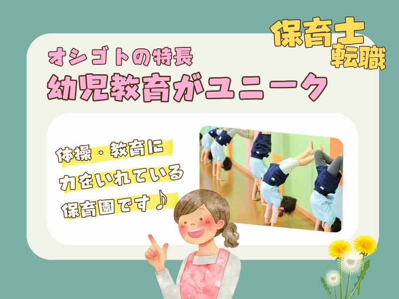 アピールポイント: ✨️わたしたちの仕事の、ここがポイント✨️ ▶ICT化で先生方の負担軽減 手書きの連絡帳など、アナログで時間のかかる仕事は廃止。手作りで想いを込めるべき仕事と、簡素化して子どもに集中するべき仕事を正しく見極めながら、現場の負担軽減をとことん追求しています。 ▶ゆとりある職員配置 担任+α、十分な人数で子どもたちを見守るために、環境整備に努めています。 ▶先生方の経験や想いを高く評価 園長自身が他園からの転職を経験。「保育士」という仕事で子どもたちのために働き続ける、そんな皆さんのために、待遇面の強化や業務内容の効率化、その分、子どもたちと向き合う時間の確保を大切に、園運営がなされています。 ▶子どもの健全な発育を願うメソッド 自由に、主体的に。そして同時に、適切な時期に多彩な刺激で、こころも体も育まれるように。独自のメソッドで、子どもたちの養育をおこないます。 「砂場で遊ばせるだけでいいのかな…」 「もっと今のうちから、いろんなことを体験させてあげたいな」 そんな想いを持った先生方を歓迎します! ————————————