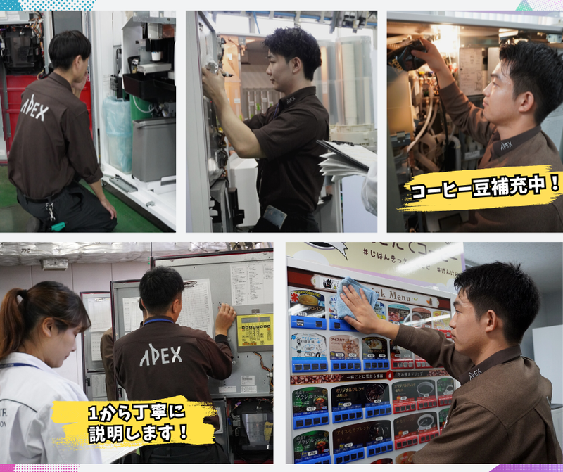 仕事内容 \未経験・第二新卒大歓迎/ ✅《企業紹介》 アペックスは「一杯の贅沢」 を届ける紙コップ式自販機の トップクラス企業。 全国のオフィスや有名施設の舞台裏 まで展開する安定基盤が強み! ✼┈┈┈┈┈ここがPoint┈┈┈┈┈┈✼ ✅「え、ここも?」舞台裏に潜入! ✅年3回のボーナスで収入も納得 ✅原則転勤なし!地元で腰を据える ✅自販機のプロ「技能士」へ成長! ✼┈┈┈┈┈┈┈┈┈┈┈┈┈┈┈┈┈✼ ✅街の「秘密」に触れる楽しさ 専用車で担当エリアを巡回。 ルートエリア ・有名企業の社員食堂 ・空港や駅の「関係者入口」 ・公的施設やエンタメ施設の舞台裏 具体的な仕事内容 ・コーヒー豆や原料の補充 ・釣り銭回収、清掃、点検 ・「次は何が売れるか」予測 1日10〜20台、1台約20分。 自分のペースで効率よく 回るのが楽しさのコツです! ✅《研修はたっぷり2ヶ月間》 「覚えるのが大変そう…」 そんな不安も、2ヶ月間の マンツーマン研修で解消! 面倒見の良い先輩たちが 「マシンのコツ」を面白く 伝授するので未経験でも安心。 丁寧にかつスピーディーに お仕事に取り組む姿勢があれば即戦力候補です!