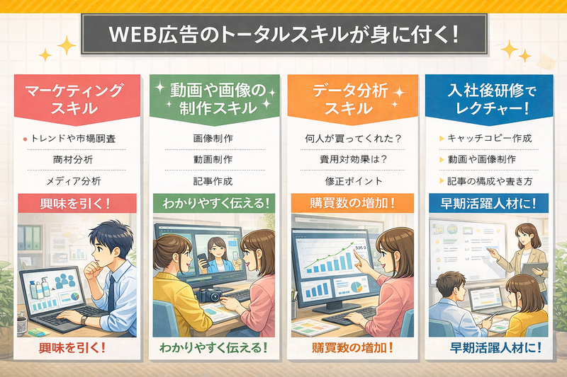 仕事内容: ✅ Instagram・TikTokなどに配信される広告の企画・改善 ✅ 「誰に見せるか」を決め、「どんな見せ方が刺さるか」を設計 ✅ 画像や動画の方向性を考え、実際に配信 ================= ■仕事の進め方 まずは「誰に届けるか」を決めます。 次に、「どんな見せ方なら気になるか?」を考えます。 画像や動画の構成を設計し、広告として配信。 配信後は、 ・どの広告が反応良かったか ・どこを直せばもっと良くなるか をチームで振り返ります。 広告は“出して終わり”ではありません。 改善を重ねながら、成果を伸ばしていきます。 ================= ■具体的な業務内容 ・WEB広告の設定・配信管理 (Google広告/SNS広告など) ・広告の企画立案 ・画像/動画/記事の制作・ディレクション ・配信結果の確認と改善提案 当社では、広告配信だけでなく 画像や動画制作にもに関わります。 動画制作やSNS投稿の経験がある方は、その強みを活かせます。 「配信だけ」「制作だけ」ではなく、 両方を扱えるマーケターへ成長できます。 ================= ■未経験でも大丈夫? 未経験OKです。 ただし、“なんとなく”ではなく、 本気で挑戦したい方を歓迎します。 最初は先輩と一緒に案件を担当。 配信設計の考え方から学び、少しずつ実践へ進みます。 1年でリーダーに昇格した社員や、 3年でサブマネージャーになった社員もいます。 ================= ■この仕事で身につく力 ・売れる仕組みを考える力 ・改善を積み重ねる力 ・企画力 ・実践的なWEBマーケティング力 広告運用は「作業」ではなく、 事業の成長に直接関わるポジションです。