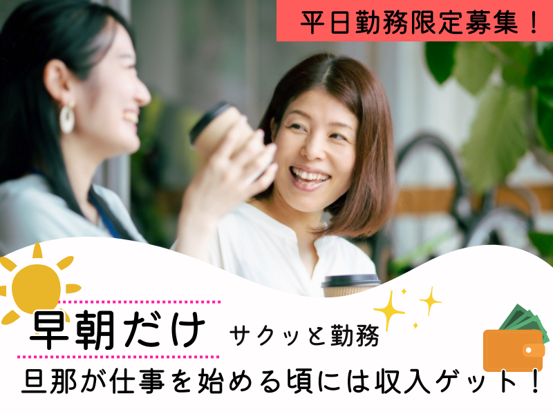 勤務時間詳細 【平日限定募集!土日はお休み♪】 ■勤務時間 (1)5:30~9:30 (2)6:00~10:00 ※残業はほぼありません。 - *朝の時間を有効活用して、 午後は自分の素敵な時間をお過ごしください ■月曜~金曜のうち週3日~勤務OK - *勤務曜日の相談は気軽にOK! 私生活×仕事が両立しやすい環境で、 みんなノビノビ働いています!