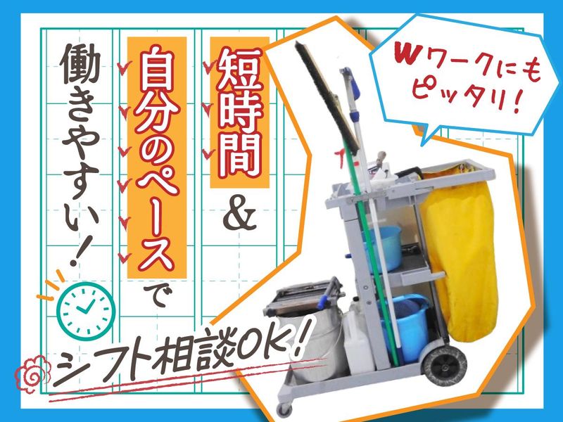仕事内容 \昨年にオープンしたばかり!/ \新規物流センターの清掃です♪/ ●お仕事内容は、センター内の共用エリア(トイレ・通路・休憩室など)の清掃です。 ※女性専用エリアの清掃もあり。 ※倉庫内は対象外になります。 ●4階建てになりますが、各担当エリア毎に分かれて作業して頂きます。 基本的に担当エリアを一人で作業して頂きますので、自分のペースで働けます。 ☆キレイな物流施設!快適な空間で働けます♪ ☆初めての方大歓迎!一つひとつ丁寧にお教えします。覚えやすい内容からスタートしていきましょう♪ ☆物流センター内の限られたスペースの作業になりますので、無理なく働いて頂けます! <活用しやすい♪お昼までの短時間勤務!> ◆サクッとお昼には終了♪ご家庭のことなどを優先して働けます♪ ◆Wワークにも便利!お昼に作業が終わって小休止してから⇒午後から別のお仕事…なんてことも可能です!
