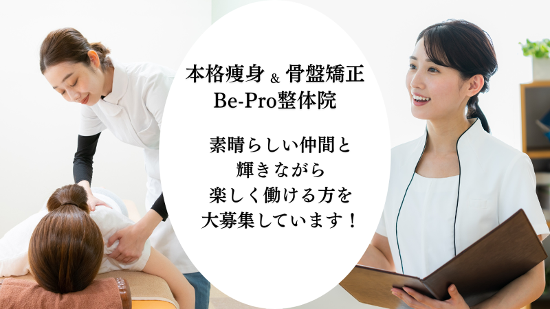 アピールポイント: Be-Pro整体院では、 未経験の方でも自信を持って現場デビューできるよう、 手厚い研修制度を整えています。 ・入社後の基礎研修からスタート どんなスタッフでもお客様にしっかり向き合えるよう、 Be-Pro独自のマニュアルと研修カリキュラムを用意しています。 施術技術だけでなく、 ・体の仕組み ・痩身・体質改善の考え方 ・カウンセリング・接客の基礎 まで、ゼロから丁寧に学べるので 「整体や美容は初めて」という方も安心してスタートできます。 ・最短1~2ヶ月で施術デビュー可能! Be-Proの痩身整体・体質改善プログラムは、 理論が明確で再現性の高い技術のため、未経験の方でも習得しやすいのが特徴です。 早ければ1ヶ月目で施術デビューが可能。 「自分の手でお客様の体が変わっていく」 そんな感動を、早い段階で実感できます。 ・入社後も成長し続けられる環境 デビュー後も、 ・定期的なスキルアップ研修 ・知識・技術のアップデート ・カウンセリング力向上のサポート などを通して、常に学び続けられる環境があります。 痩身・整体・食事・生活習慣の知識が身につくので、 お客様だけでなく、自分自身の体や健康にも役立つのがBe-Proの魅力です。 【未経験スタートの先輩の声】 (前職:事務/販売/接客など) 正直、最初は「整体や痩身って難しそう…」と不安でした。 でも研修で基礎から丁寧に教えてもらえたので、 少しずつ自信を持って施術に入れるようになりました。 お客様から 「体が軽くなった」 「周りに痩せたって言われた」 と喜んでもらえる瞬間が本当に嬉しいです。 今では、自分自身の体や生活習慣も変わり、 この仕事を選んで本当に良かったと思っています。 ⏰ 1日の仕事の流れ(例) 9:00|出勤・準備 店内清掃、予約確認、カルテチェックなど 9:30~|施術・カウンセリング 1日4~5名の完全予約制 お一人おひとりと丁寧に向き合います 13:00~|休憩 しっかり休めるので午後も集中できます 14:00~|施術・アフターフォロー 体の変化や生活面のアドバイス、次回提案など 17:30~|締め作業 カルテ入力、片付け、翌日の準備 18:00|退勤 残業はほとんどありません◎ ⭐ なぜBe-Pro整体院はリピートされるのか Be-Proが選ばれ続ける理由は、 「その場しのぎ」ではないからです。 ✔ 根本改善を重視した施術 骨格・姿勢・生活習慣まで見て、 リバウンドしにくい体づくりをサポート。 ✔ 丁寧なカウンセリング マニュアル通りではなく、 一人ひとりに本気で向き合う接客を大切にしています。 ✔ 変化が“実感できる”プログラム 体重・サイズ・見た目・体調の変化を 一緒に確認することで、信頼と満足度が高まります。 ✨ こんな方にぴったり ・未経験から手に職をつけたい ・人に喜ばれる仕事がしたい ・流れ作業の施術に疲れてしまった ・長く続けられる仕事を探している