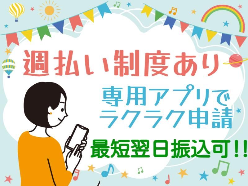 【保険制度】 雇用保険、労災保険、健康保険、厚生年金 待遇・福利厚生 【福利厚生】 ・社会保険完備 ・交通費規定支給 ・敷地内駐車場完備 ⇒作業場まで徒歩3分以内 ・昇給あり ・制服、靴貸与 ・資格取得支援制度あり ・髪型自由 ・鍵付き個人ロッカーあり ・飲食、休憩スペースあり ⇒日替わり弁当の注文可(1食400円~) ⇒電子レンジ・冷蔵庫・ポットの利用可 ・格安なカップ麺、パンの自動販売機あり ・寮対応相談可 【週払い制度あり/規定】 専用アプリで簡単申請! 最短、翌日に振込みが可能◎ ※希望者は専用アプリを事前登録して頂きます。