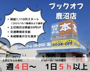 インフォメーション \始業・終業時間のご希望をうかがいます!/ 9:30~20:00の営業時間内で勤務。ホビー、カード、本などに囲まれてお仕事したい方募集中!シフト制で働きやすく、難しい接客がないので未経験者の方にもオススメ! ★ブックオフ鹿沼店取扱商品★ 本(書籍・雑誌・コミック)、CD、レコード、 DVD、ブルーレイ、ゲームソフト、 ゲーム機本体、トレカ、フィギュア、 プラモデル・模型、ミニカー、おもちゃ ・社員1名、パートアルバイト12名の13名 ・20代、30代 ・主婦(夫)さん、フリーターさん ブックオフ鹿沼店でのお仕事は、 好きなものや趣味のものと合致すると、 新たな発見があり楽しめること間違いなし! ブックオフ鹿沼店は 株式会社ヌマニウコーポレーションの 運営店舗です。 アピールポイント ※この求人は急募のお仕事です。 自分力バロメータ コミュニケーション力 協調性 理解力