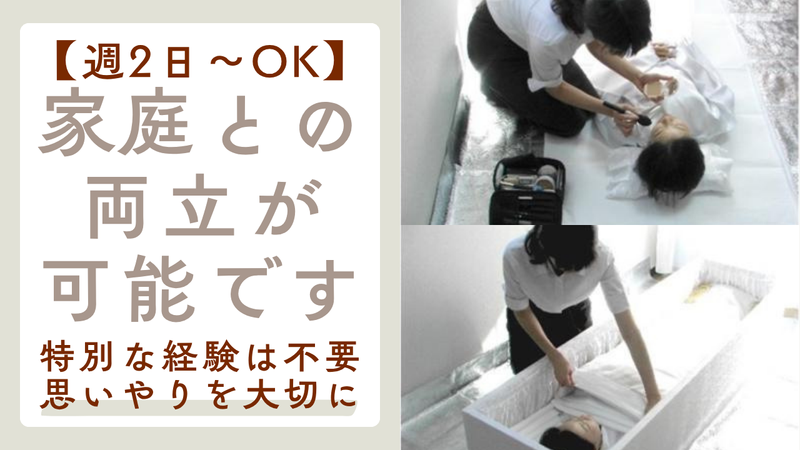 仕事内容 故人様の最期を温かく彩る 「おくりびと」。 相手を思いやる気持ち・ 人に寄り添う心があれば大丈夫ですよ。 ******************** 【仕事内容】 ご家族様とお話ししながら、ご希望に合わせ 故人様にお化粧を施し、お棺に納めたり 湯灌(入浴)を行います。 生前の面影を取り戻し、 美しい姿で旅立っていただくためのお仕事。 お支度の際には、故人様が どのようなものを好まれていたか、 どんな化粧や服装がお好きだったかなど、 人物像をしっかりお伺いすることが大切です。 お話を聞くことで、お支度の方向性が 明確になっていきます。 ※故人様の着替えをする際、 多少の力(体力)が 必要になる場合もあります。 ******************** 【 未経験者歓迎!資格不要 】 専門的な知識が必要な場合もありますが 心配しなくても大丈夫。 チームで補い合いながら、 ゆっくりと慣れていきましょう。 また、湯灌、お化粧、旅支度では ご家族様にも同席していただいてます。 「最後まで見送ってあげたい」 その思いを大切にし、寄り添いながら ご希望を叶えていきましょう。 特別な経験や技術よりも、 私たちは「気持ち」を大切にしています。 ご家族様に寄り添い、 時には生前の思い出話をしながら、 旅立ちの支度を進めることが多くある為、 介護・接客・営業経験のある方、 コミュニケーションを大切にできる方は すぐに溶け込めるお仕事ですよ。 優しい気持ちで 相手の立場に立つことができれば、 自然と知識は身に付きます。 ******************** 【お子さんのお迎えや急なお休みも、 チームワークでカバーします。】 困った時はお互い様! 一緒に頑張りましょう◎ 当社のパートスタッフのほとんどは 子育てママさん! 緊急事態にはバツグンの チームワークを発揮します。 子育ての大変さを知っているからこそ、 支え合う関係性が自然とできるんです。 育児も仕事も頑張りたいアナタ、 私たちと一緒に働いてみませんか? ******************** 【私たちの取り組み】 エンゼルケアでは、ご家族の方に 湯灌(体を清めること)やご納棺にまで 参加していただき、ご一緒に故人様の 身支度を整えていただきます。 それは後悔のない お別れをしていただきたいから。 最後に過ごした時間は、 残された方の心にいつまでも大切に残ります。 ご家族の方々が、 また前を向いていけるように、 私たちの存在があるんです。 ほかにも疑問や不安があると思いますので ご希望であれば、ぜひ見学にお越しください。 故人様との思い出が 自然と蘇るようなひとときを あなたの手で創っていきましょう。 ******************** 【働きやすさを1番に。強みを活かせます!】 現場をメインで管轄しているのは 女性社員の2名。 他スタッフのさまざまな意見を 柔軟に聞き入れて 働きやすい職場づくりを進めています。 たとえば、接客経験者にはヒアリングを 手先が器用な方には お化粧をメインで任せるなど 適性や希望に合わせた 割り振りを行っています。 会社にとって、 頑張ってくれているスタッフが 気持ちよく働けることが一番大事。 こうした姿勢が定着率にも繋がっており 長く続けているスタッフもいるほどの 居心地のよさが魅力です。