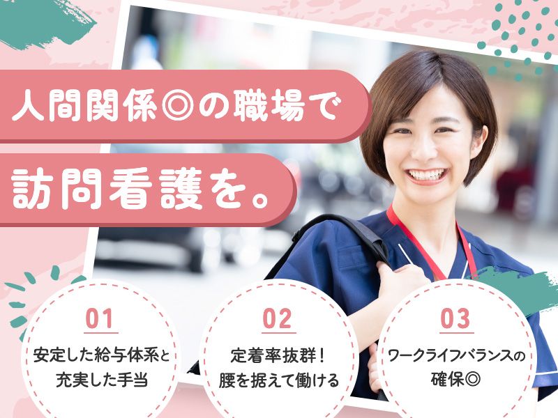 仕事内容 ~✨看護の仕事をもう一度✨~ 子育てが落ち着いた方など ブランクがある方大歓迎! 働きやすさも抜群です◎ +・・・・・・・・・・・・・・・・・・・・・・・・・・・・+ 寄り添う看護で、暮らしに安心を あなたの経験が活きる環境! 病院勤務からキャリアチェンジ したい方も大歓迎です〇 +・・・・・・・・・・・・・・・・・・・・・・・・・・・・+ \働くうえでのポイントは?/ ☑高い定着率!人間関係良好♪ ☑年間休日120日!しっかり休める〇 ☑賞与年2回〇年間給与3ヶ月分支給✨ ☑各種手当充実♪給与UPも見込める! <仕事内容> 主治医の指示により、利用者様の自宅へ 訪問し看護業務を行ってもらいます。 ▽具体的には••• □全身状態の観察 □指示による医療処置 □入浴介助 □褥瘡予防処置 □Drとの連絡調整 □報告書作成 □カルテ記入 など <教育体制> 必ず全利用者に同行訪問し指導します。 訪問前にカンファレンスを行うので安心。 これまでの経験を活かしながら、 より高いレベルで働けます。 わからないことはなんでも相談OK!