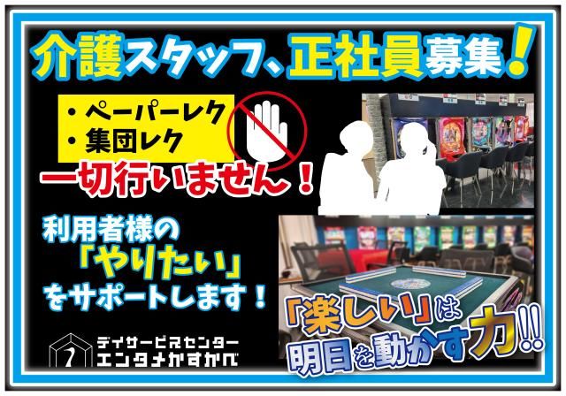 【介護職員/正社員】アミューズメント系デイサービスセンターで新スタートを!髪色・ネイル等自由! 介護の未来形を一緒に作っていきませんか! パチンコやパチスロ、麻雀など自分の世界に没頭できる施設づくり…。 実は脳の活性化や身体機能の回復を促す効果があるんです。 現代のお年寄りは、ゲームに興じる方が圧倒的に増えています。 しかし、デイサービスの現状はレクリエーションを開催したりしていますが、 本当に利用者様のニーズに合っているのかという疑問からスタートしました。 今日も行きたい、明日も行きたい、そういう施設を一緒に作ってくれる仲間を求めています。 利用者様だけでなく、皆が幸せに過ごせるように調整してくれるような方と一緒に働けたら嬉しいです!