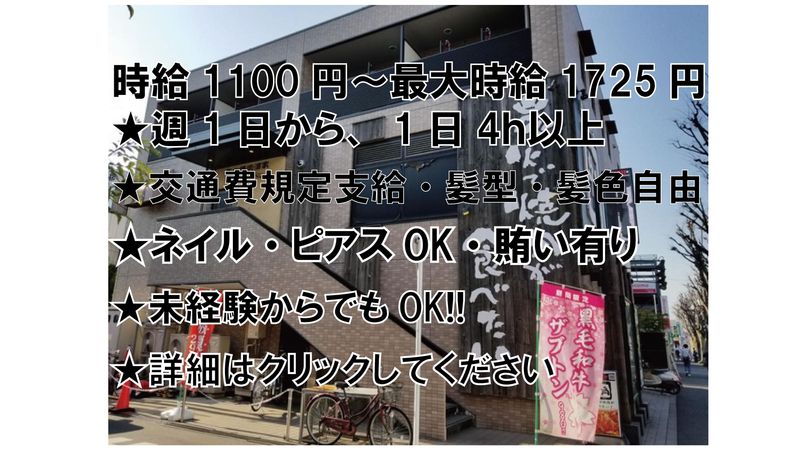 【保険制度】 雇用保険、労災保険 待遇・福利厚生 【福利厚生】 交通費規定支給、賄い有り※無料、制服貸与、昇給、ネイルOK、ピアスOK 髪型、髪色自由 研修100h 時給1140円