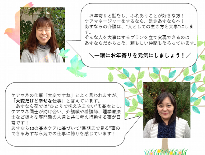 アピールポイント: ≪自信あり!最先端のケア≫ 「あすなら10の基本ケア」を取り入れ、生活リハビリを通じて自立支援を行っています。 * オムツなし * 機械浴なし * 拘束なし 利用者様があたりまえの生活を送れるよう、日々取り組んでいます✨ ≪ケアマネ説明会開催中!≫ 「ケアマネとしての経験はないけど大丈夫?」 「どんな研修制度があるの?」 「ケアマネのやりがいは?」 「どれくらいプランを持つの?」 ・・・そんな不安をお持ちのかた、まずは一度お話しを聞いてみませんか? 当日は、実際にケアマネさんの面接・研修を担当する担当者と ゆっくり、ざっくばらんにお話しできますのでお気軽にご参加ください。 平日は随時開催可能ですので、 ご希望日/ご希望時間(2時間程度)で説明会を調整いたします。 土日祝の開催についてもお気軽にご相談ください。 申込方法:ご応募→メッセージでお申込みお待ちしています✨