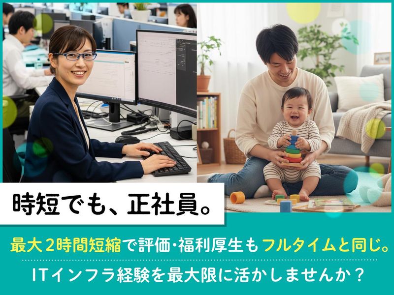 仕事内容 「時短だから」といって、責任のある仕事を任せてもらえないわけではありません。 当社が導入している「ショート正社員制度」は、”何かを諦める選択”ではなく、家庭も仕事も頑張りたい方を支援するための制度です。 そんなあなたをチームメンバーも尊重し、協力してくれる体制が当社では整っています! /////////////// 【この求人のポイント3つ】 [1]評価・昇給はフルタイムと同基準 時短勤務であっても、あなたのスキルや成果に対する評価基準は変わりません。プロジェクトへの貢献度に応じたインセンティブ賞与もあり、納得感のある報酬が得られます。 [2]上流工程・モダン環境の案件多数 設計・構築などの上流工程には納期が付きもの。”時短だと間に合わないから”といった理由で運用保守の案件だけ任せるのではなく、AWS/Azureなどのクラウド環境構築、ネットワークの要件定義など、あなたの経験に見合ったフェーズをお任せします。 [3]1日最大2時間の時短が可能 30分単位で調整可能です。朝を遅くする、夕方を早くするなど、生活スタイルに合わせて設定できます。 /////////////// 【仕事内容】 インフラ設計・構築の経験をお持ちの方に、クラウド・ネットワーク・サーバなど、ご経験に応じた案件をお任せします。 運用保守の経験しかない方でも、3年以上の経験があり設計構築にチャレンジしたい方にはスキルに応じた案件をアサインします。 ▼お任せするプロジェクト例 経験豊富なあなたには、以下のような設計・構築案件をご用意しています。 *官公庁向けクラウド基盤(AWS/Azure)の設計・構築 *大手メーカーのネットワーク再設計・システム刷新支援 *データセンターでの仮想化基盤構築 *セキュリティソリューションの導入・構築 /////////////// 【柔軟な働き方とキャリアを両立】 小学校卒業まで利用できる「子の看護休暇」や、学校行事のための「子ども行事休暇」などの有給制度や、育休取得率は女性100%・男性91.2%と非常に高く子育ても両立しやすい環境です。 年間休日は120日以上に加え、有給取得率86.9%、月平均残業時間は7.0時間の中でも、豊富な案件数と充実した教育制度によりITインフラのスキルを着実に高めることができます! 【公正で安心な評価】 年2回の評価・昇給制度により、日々の努力や成果を正当に反映。さらにプロジェクト貢献度に応じたインセンティブ賞与もあり、頑張りが確かな報酬につながります。時短勤務だからといって評価が変わることはありません。