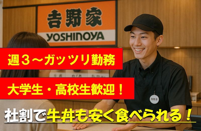 仕事内容 吉野家のアルバイトスタッフの募集です☆ 【仕事内容】 牛丼屋にてレジ・テーブルの片付け・調理・配膳などをお任せ! お肉は既に切ってあるものを調理するため包丁は使いません! 難しい作業なしなので安心♪ 【働く上でのポイント】 ✅週1日~OK ✅1日3時間~OK ✅平日のみOKだから家庭とも両立◎ ✅シフト相談もしやすいので、学業は家事との両立◎ ✅お子様のお迎えなどももちろん考慮 ✅カンタン作業ばかりなので安心 ✅マニュアル完備で先輩スタッフも丁寧に教えるから未経験も安心☆ 【実際勤務しているのスタッフの声】 『子供の体調が悪い時にお休みを頂けました♪』 『シフトの融通が利くから授業も遊びも旅行も調整しやすいです!』 『テスト期間も考慮してくれるのが嬉しい』 『未経験でもすぐに仕事慣れましたよ♪』