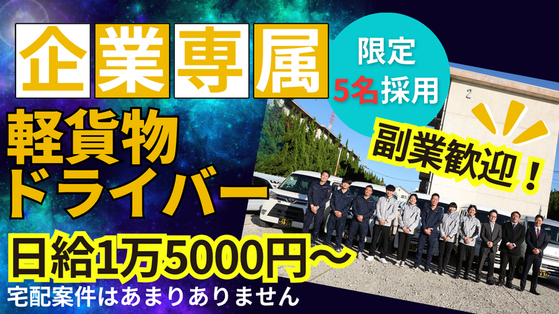 仕事内容 \スキマ時間を有効活用!/ 企業専属の軽貨物配送ドライバー ★ルート固定 ★直行直帰OK ★手積み・手降しできる荷量 ✥✤✥✤✥✤✥✤✥✤✥✤✥✤✥✤✥✤✥✤✥✤✥ 【お仕事内容】 お任せするのは、企業専属の軽貨物配送。 軽自動車で荷物を積み、 決まった企業先へお届けします。 ※宅配案件はあまりありません。 ✅ 配送先はほぼ固定! ⇒ルートを覚えれば効率よく回れます ✅ 荷物は段ボール1箱などの軽量物中心 ⇒大型品ナシ! ✅ 基本的に自宅から直行直帰 ⇒事務所に寄る必要なし! <<企業専属便の詳細>> 某大手コンビニのタバコ什器配送 某大手上場企業パン配送 某製薬会社医薬品配送 など これらは企業と直接契約をしているので、 運送会社を間に挟んでいる案件はほぼありません!! ✥✤✥✤✥✤✥✤✥✤✥✤✥✤✥✤✥✤✥✤✥✤✥ ✨\自由な働き方が魅力!/✨ 【時間帯】24時間いつでもOK! ご希望の時間帯に合わせて働けます。 ◎「Wワークで夜だけ」 ◎「日中の空いた時間に」 ◎「週末だけガッツリ稼ぎたい」など ライフスタイルに合わせて働けます! 現在、20代~50代まで幅広く活躍中! ✨充実のサポート制度✨ ◆ガソリンカード貸与 希望者にはガソリンカードを お渡しします! ◆ETCカード支給(法人用) ◆車両レンタル制度あり(ナビ付き) 会社で軽貨物車両を用意できる 制度があるので マイカーがなくても安心! ✥✤✥✤✥✤✥✤✥✤✥✤✥✤✥✤✥✤✥✤✥✤✥ 「しっかり稼ぎたい」 「空いた時間を有効活用したい」 そんな方にピッタリのお仕事です! 少しでも興味があれば ぜひお気軽にご応募ください♪