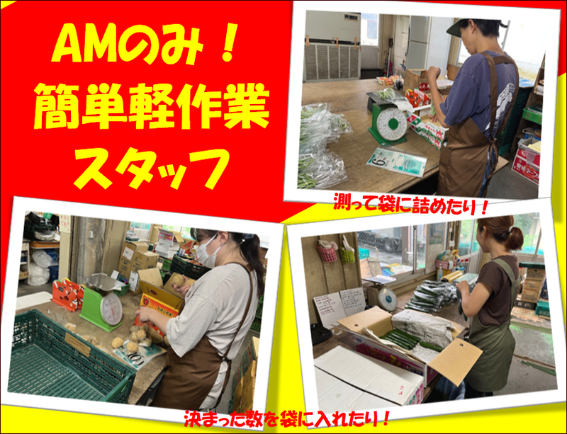 仕事内容 \野菜や果物を袋やトレーに入れるだけ/ *初日からできる簡単軽作業! *AMだけの短時間ワーク! *土日休みOK!でプライベートと両立♪ 【仕事内容】 野菜や果物を袋やトレーに入れたり、お花を束ねるといった簡単な軽作業♪特別な経験やスキルは全く必要ありませんので、誰でも初日からスグにマスターできます! ここはお願いpoint!→常時ではないですが、重いものを持つタイミングがあります。面接時に実際持ってみてもらうトライもできるのでぜひお気軽にご応募ください♪ 【プライベートと両立OK!】 お仕事は昼12:00までの短時間◎お子さんがいる主婦(夫)の方も、余裕をもってお迎えできます!家庭と両立しながら働く、ご近所住みのスタッフが多数活躍しています! 【オシャレも楽しめる!】 衛生上の問題がない範囲であれば、髪型・髪色・ネイル・ピアス・ネックレス・ひげなど全て自由♪エプロンの貸与もあるので、服が汚れる心配もなし! 【先輩スタッフからのコメント】 未経験からのスタートで不安でしたが、先輩スタッフからの親切な指導&簡単な作業内容で安心して始めることができました。 今ではいちスタッフとしてやりがいをもって働けています!また、シフトが曜日固定&AMのみのお仕事なので、家事や育児とも両立しやすいのも魅力の一つです♪ 同世代主ふが和気あいあいと働いています。皆さんも一緒に楽しく働きましょう♪