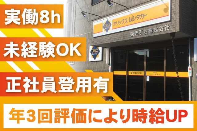 仕事内容 オリックスレンタカー店舗スタッフ(フロント・受付) 契約社員募集 20代、30代、40代、50代、60代の男女活躍中 未経験者でも大丈夫! 先輩スタッフがしっかりサポート (具体的な仕事内容) ・お客様のご出発・ご帰着対応 (ご利用内容の案内、車両操作説明、傷チェック、料金清算など) ・電話またはご来店のお客様の対応(受注等) ・洗車・日常点検(点検表に既存の傷や消耗品の残量などを記入) ・近場の配送や引上げをお願いすることもあります ・パソコン入力作業は決まった書式への入力がほとんどです →車検/点検管理、車両使用予定管理、空車情報確認など、 複数の専用システムを使います。 ※使い方は簡単です。 レンタカー店舗での業務は フロントとバックヤードに大きく分かれています フロントで受注→バックヤードで車両準備→フロントで貸出 ・フロント:お客様のご要望に合う車両を提案 レンタルの手続きやお問い合わせに対応 ・バックヤード:車両準備、洗車、簡単な点検、簡単なメンテナンス 今回の募集は主にフロントを担当していただくスタッフです お客様へのご説明に車両知識が必要なので、 ひととおりバックヤード業務も学びます フロントとバックヤードが協力して、 お客様に最高のサービスを提供することを目指します! (おすすめポイント) 〇要普通自動車免許(AT可) 〇自動車業界で働いていた方(カーディーラーや整備士等) 〇大型・中型・MT免許をお持ちの方は、活かせます! 〇人と接する仕事が好きな方 〇周りの仲間と一緒に目標やゴールを目指していける方 〇19歳から60代まで幅広い年齢のスタッフが活躍しています 〇学歴不問 〇頑張り次第では最短3ヶ月で正社員になれます! (未経験でもOK) 特別なスキル・知識は必要ありません。 未経験からお仕事を始めた方が たくさん活躍しています。 分からないことは先輩スタッフが 丁寧に教えますので安心してください。 シフトも相談可能なので ご旅行などの予定があるときは相談してくださいね。 (クルマ好きの方) 車両の移動を頻繁に行うため、普通免許が必要になりますので、 あらかじめご承知おきください。 AT限定免許でもOKです。 さまざまなメーカーの豊富な車種を運転できるお仕事。 (トヨタ、日産、ホンダ、スバル、スズキ、ダイハツ他 レクサスもございます!) 東光石油(株)は、 昭和44年にガソリンスタンド業として創業し、 現在はオリックスブランドのレンタカーを中心に、 リースカー業・石油製品小売業を展開しています。 ハイブリッドカー・EV車の導入や軽自動車・ レジャー向けワゴン車の充実にも取り組んでいます。