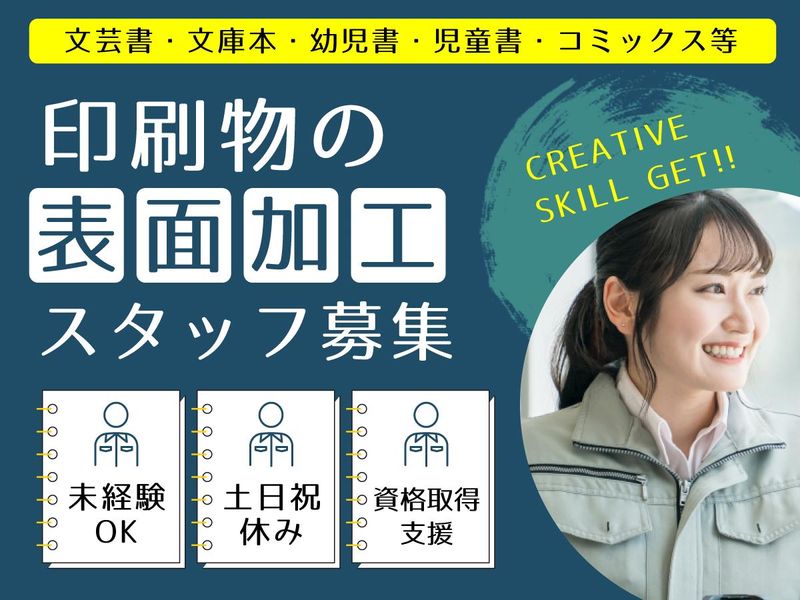 仕事内容 ⭐未経験歓迎⭐ 創業70年以上の老舗企業での ラミネート機オペレーターをお任せ! ✅日勤のみ!実働7.5時間 ✅土日祝休みの完全週休2日制 ✅資格取得支援制度など成長環境も◎ 未経験から専門職に挑戦したい方に ピッタリな環境がココにあります! ★ ―――――――――――――――― ★ コミック・書籍・紙器の ラミネート機オペレーターとして 紙の印刷物への表面加工業務をお任せします。 ⏩印刷物の表面加工について  ̄V ̄ ̄ ̄ ̄ ̄ ̄ ̄ ̄ ̄ ̄ ̄ ̄ ̄ ̄ ̄ ̄ ◆光沢コート( グロス・マット ) ┗印刷物にローラーを使って 光沢剤を塗る技法です。 機能性 ( 耐熱、耐摩擦など ) を高める加工です。 ◆プレスコート( グロス ) ┗印刷物に光沢剤を塗り、熱と圧によって 鏡面板に圧着させる技法です。 表面に艶を出す効果があります。 ◆ラミネート (グロス・マット・ホログラム等) ┗印刷物に接着剤付きのフィルムを 熱圧着させる技法です。 印刷物の表面保護と耐久性をあげる 効果をプラスします。 ◆UVラミコート (グロス・マット・ホログラム) ┗印刷物に紫外線硬化性の光沢剤を塗り、 フィルムを密着させて紫外線を照射し、 硬化させた後、印刷物を剥がす技法です。 樹脂凸版を用いてスポット加工も可能。 ⏩業務の基本的な流れ(ラミネートの場合)  ̄V ̄ ̄ ̄ ̄ ̄ ̄ ̄ ̄ ̄ ̄ ̄ ̄ ̄ ̄ ̄ ̄ ̄ ■フィルムを機械にセットする ↓ ■紙をを機械にセットする ↓ ■ローラーで熱圧着させる ↓ ■紙と紙の重なっている部分をカットする ↓ ■完成 ※各工程で作業の手順が決まっており 機械操作は先輩オペレーターが 丁寧に教えていきます。 疑問点は都度ご質問できる環境です。 専門知識がない方でも問題ありません。 ⏩入社後の業務について  ̄V ̄ ̄ ̄ ̄ ̄ ̄ ̄ ̄ ̄ ̄ ̄ ̄ ̄ ̄ ̄ ̄ 最初は検品、紙積み作業等が中心です。 慣れてきましたら、 ラミネート機やコーティング機の オペレーターとして 作業を行っていただきます。 ⏩スタッフにも真剣に向き合う風土  ̄V ̄ ̄ ̄ ̄ ̄ ̄ ̄ ̄ ̄ ̄ ̄ ̄ ̄ ̄ ̄ ̄ 安全・安心を追求するためにも、 スタッフ自身が健やかに働いてほしい という想いがあります。 年間休日120日以上、土日祝休み、 実働も7.5時間と短めで、 働きやすい環境整備にも積極的に取り組み スタッフが安心して成長できるよう 日々努めています。 ⏩将来性も期待できる環境  ̄V ̄ ̄ ̄ ̄ ̄ ̄ ̄ ̄ ̄ ̄ ̄ ̄ ̄ ̄ ̄ ̄ 資格取得支援制度をはじめ、 業務範囲やレベルアップに伴い、 資格取得の推奨やスキルアップなど 教育環境も整えています。 ⏩当社について  ̄V ̄ ̄ ̄ ̄ ̄ ̄ ̄ ̄ ̄ ̄ ̄ ̄ ̄ ̄ ̄ ̄ 当社は、書籍・雑誌等(文芸書・文庫本・ 幼児書・児童書・コミック本等)の 表紙、カバー、帯のような紙の印刷物に、 表面加工を施すことを メインに手掛けている会社です。 その他、「成型材料」の分野でも 事業展開しており、街のお菓子の専門店や コンビニエンスストア、スーパー等で 販売されているプラスチックの デザート容器を成型する 樹脂材料の代理店販売も行っています。