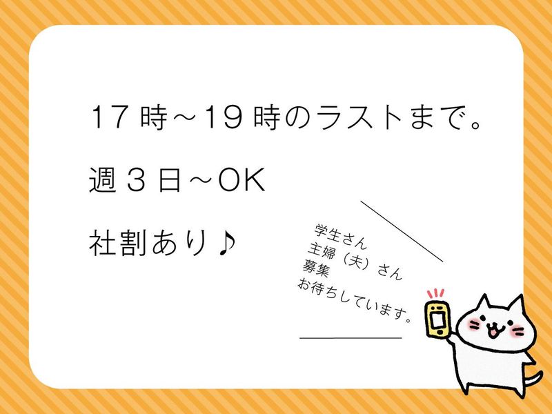 勤務時間詳細 17:00~ラストの19:00まで ※1日2時間程度、週3日~ ※ただし、17時前からの勤務も可能です。 フルタイム希望の方もご相談ください。