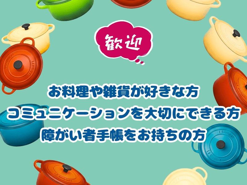 求めている人材 募集要項 必須条件:閉店時間の20時30分まで勤務 ※20:30までであれば時短可 求める人物像: ●お料理や雑貨が好きな方 ●コミュニケーションを大切にできる方 勤務時間: 09:30〜20:30のうちから ●~20:30まで勤務できる方 ●週3日〜OK ●時間・曜日のご希望OK 障がいへの配慮について 一人ひとりの特性にあう働き方を一緒に考えていきたいと思っています。 配慮の一例: 業務指示をマニュアルや書面で明確化します。 体調に応じた休憩の取り方などを定期的な面談でフォローします。 立ち仕事が中心となりますが、状況に応じた作業内容の調整が可能です。 朝はゆっくりしたい方に最適な遅番募集です。 早起きがあわない方、午前中に通院がある方などにもオススメ!