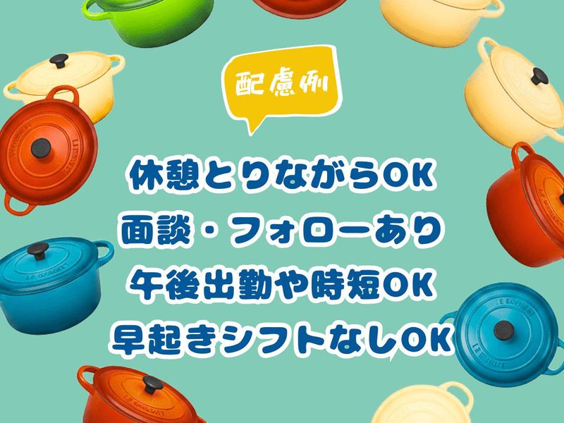 仕事内容 ●遅番歓迎 ●時短勤務OK ●フルタイムもOK ●学生さんも活躍中 ●長期も短期も可 【ル・クルーゼ】 三井アウトレットパーク北陸小矢部店 店舗販売サポートスタッフ募集 ※障がい者採用 心温まるキッチンウェアを届けませんか? 色鮮やかなお鍋や食器に囲まれて、 料理の楽しさを支えるお仕事です。 閉店時間まで一緒に勤務できる方を募集します。 お仕事内容 店舗の運営を接客サポートとして支えていただくお仕事です。 接客サポート:お客様への簡単なご案内やお会計の補助をお願いします。 商品の品出し・陳列:新しく入荷したお鍋や食器を棚に並べます。 在庫管理:バックヤードでの整理整頓。 清掃:店内を清潔に保ちます。