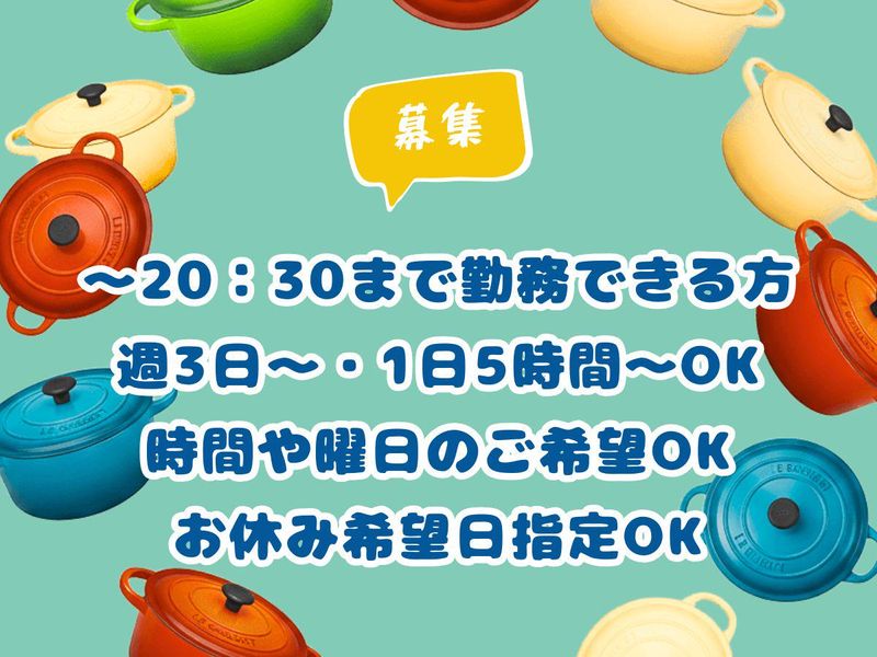 勤務時間詳細 ●遅番や20:30まで勤務できる方 ●週に3日以上でOK ●フルタイム歓迎 ●お試し短期からスタートできる ●長期・短期契約どちらもOK 勤務時間の選択自由: 10:30~20:30のうち5時間以上入れる方 20:30まで入れる方は優先採用中 月1回のシフト制: お休みの希望日をお伺いします。 フルタイムは月に10日程お休みがあります。 ※希望日指定可