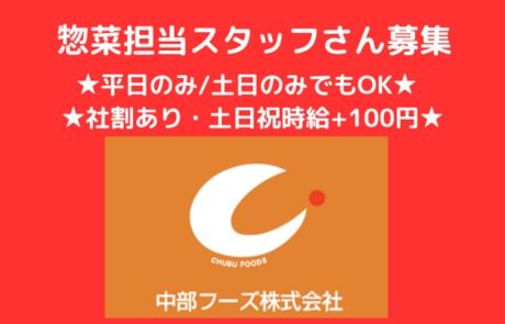 仕事内容 \春休みの1ヶ月だけでもOK!楽しく働いてサクッとお小遣い稼ぎ!/ スーパー内のお惣菜コーナーで、カンタンな調理補助や盛り付けをお願いします! 包丁を持ったことがなくても大丈夫、レシピ付きでひとつずつ覚えられます◎ <お仕事内容> ・唐揚げやお弁当のおかずづくり(マニュアルあり) ・出来上がった商品のパック詰め ・売場への陳列・補充 「飲食バイトは初めて…」という方でも安心! 接客は少なめ&裏方メインだから、人見知りさんにもおすすめです♪ この求人のオススメポイント★ ◎完全短期OK(春休み限定) ◎接客少なめ!裏方メインで安心 ◎土日祝は時給UPでしっかり稼げる ◎未経験スタート多数!丁寧な研修あり ◎髪型・髪色OK(常識の範囲内) ◎社員割引でお惣菜が5%OFF! 【家計に優しい!「社員割引き制度」】 中部フーズ自慢のお惣菜を全商品を5%引きで購入できます。 生鮮食品・日用品など、バロー店舗のお買い物も5%のポイント還元が可能です。 割引き制度を利用して、「ちょっとだけお値打ち」な買い物を楽しんでください♪ 職場の雰囲気 学生・主婦(夫)・フリーター・シニアまで幅広く活躍中! みんなで助け合う、明るくアットホームな職場です♪ 休憩室には冷蔵庫・電子レンジ完備! お弁当を持ってきてゆっくり休めます! 中部フーズ株式会社 デリカ部門のお仕事は、「中部フーズ株式会社(バローグループ)」との契約となります。 ※待遇面は株式会社バローに準じます。 ※給与は月末締め・翌月15日支給です。